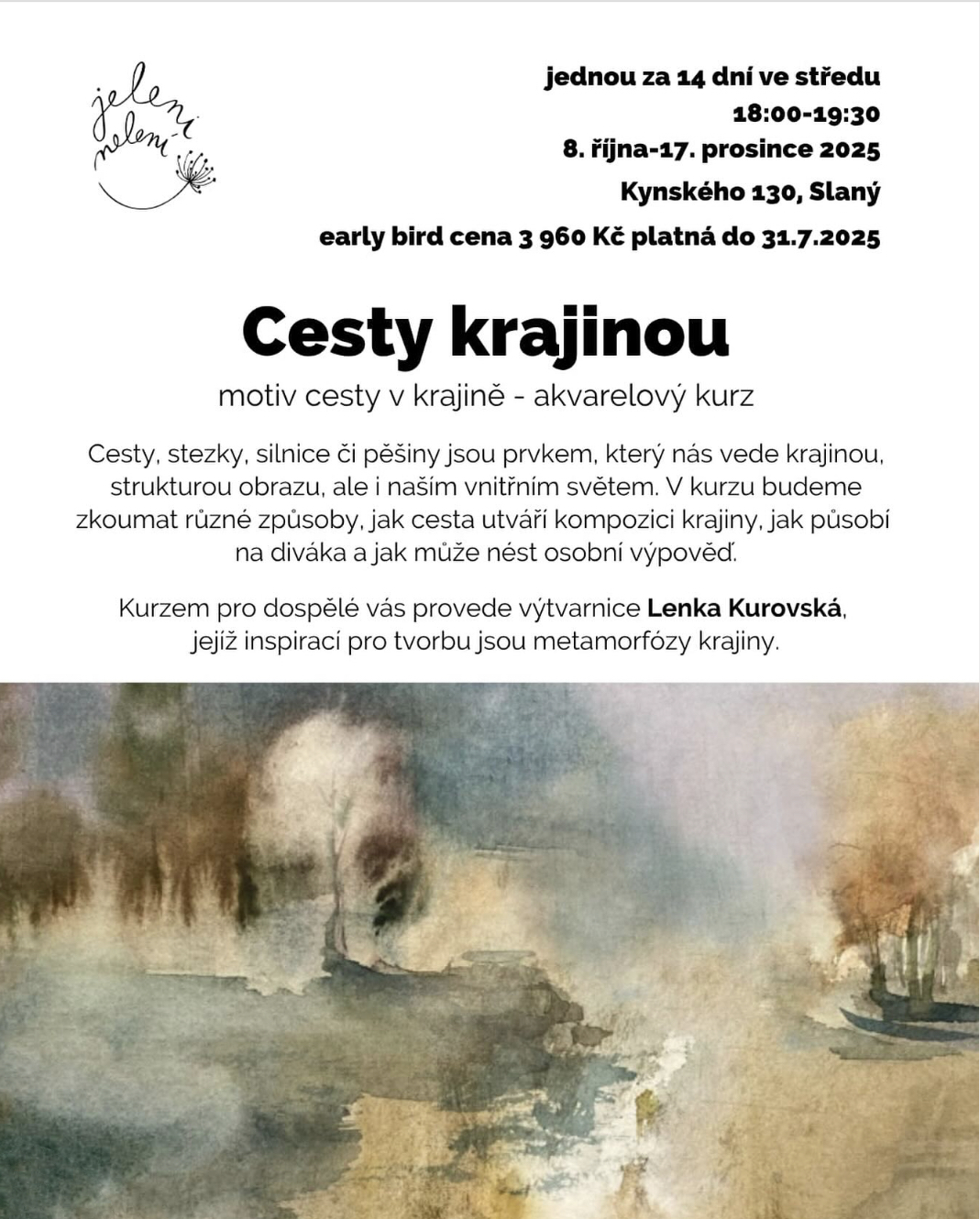 Kurz bude probíhat jednou za 14 dní ve středu 18:00–19:30 ve slánském ateliéru Jeleni nelení. Bližší informace a přihlášky naleznete zde: https://jelenineleni.cz/kurzy/cesty-krajinou-motiv-cesty-v-obraze-s-lenkou-kurovskou/